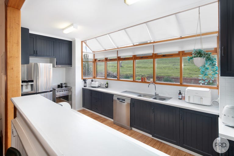 The spacious layout features three distinct living and dining areas, two bathrooms, and an updated kitchen complete with Bosch and Smeg appliances, all framed by stunning north-facing views of Scrub Hill. Outdoor living is just as captivating, with a large deck for entertaining, stone fencing, a wraparound veranda, and lush gardens brimming with camellias, daphne, hydrangeas, and vibrant spring bulbs that have flourished for decades.